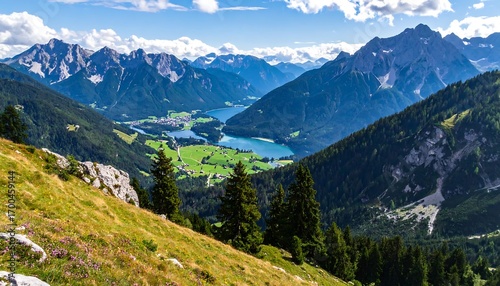 Panoramic vista of a valley nestled amidst towering alpine mountains, showcasing a serene lake and lush green meadows.