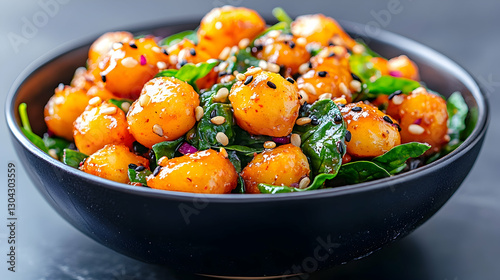 gnocchi, spinach, salad, sesame, seed, bowl, black, dark, food, dish, receipe, cooking, culinary, delicious, healthy, tasty, dinner, lunch, side, vegan, vegetarian, easy, quick, simple, eatery, epicure, homemade, fresh, ingredient, kitchen, table, photo, appetising, satisfying, flavorful, vibrant, colourful, texture, aroma, comfort, meal, plate, portion, serving, eat