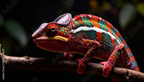 Panther Chameleon on a branch illuminated by cinematic dramatic lighting, Background