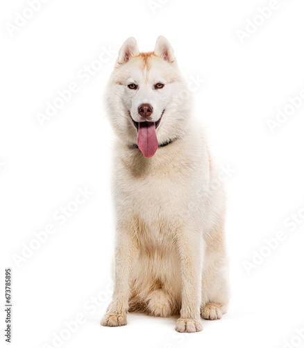 purebred dog, canino, dog, carnivore, mammal, pet, domestic, vertebrate, animal, studio, studio shot, nobody, no people, husky, siberian husky, white background, cut-out, isolated on white, isolated, white, facing, sitting, one animal, tongue, mouth open, panting, portrait, collar