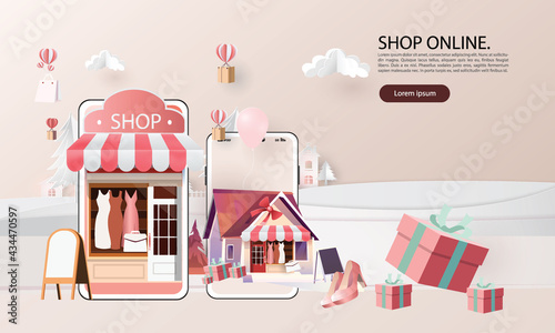 paper art online shopping on smart phone buy sell on mobile technology marketing vector illustration.