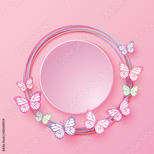 Paper butterflies and frame for text.pastel circle photo frame with colorful cut out butterflies. Greeting card template vector illustration.