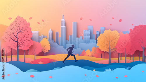 Paper Cut Illustration of a Runner in a Vibrant Park Setting with Colorful Leaves, a Flowing River, and a City Skyline Beneath a Stunning Gradient Sky