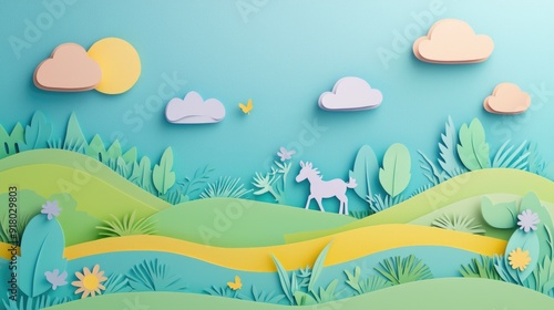 paper cut style illustration donkey colorful 3d filed green hills whimsical clouds