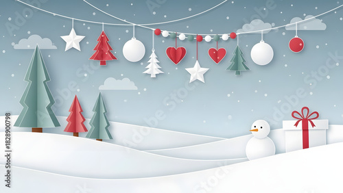 Paper Cut Winter Wonderland Snowman Gift Box Christmas Trees Hanging Ornaments Garlands Blue Snowy Background Festive Holiday