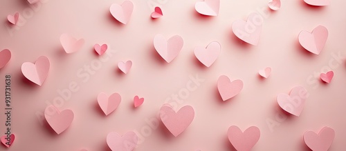 Paper hearts on a pink backdrop arranged flat Area for text. with copy space image. Place for adding text or design