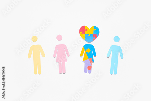 Paper human figures with heart made of colorful puzzle pieces on white background. Concept of autistic disorder