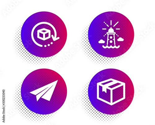Paper plane, Lighthouse and Return package icons simple set. Halftone dots button. Parcel sign. Airplane, Navigation beacon, Exchange goods. Shipping box. Transportation set. Vector