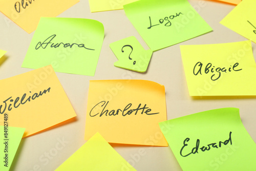 Paper stickers with different names on beige background, closeup. Choosing baby's name