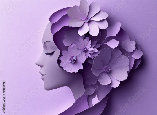 Paper woman face with flowers on a purple background