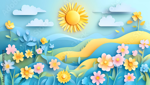 Papercraft Springtime: Delightful papercraft landscape with vibrant blooming flowers, a radiant sun, and rolling hills, evoking a cheerful and whimsical spring atmosphere.
