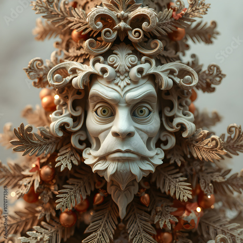 paper-crafted chrismas tree expression, Ornate details reminiscent of Rococo art.