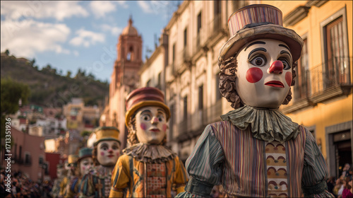 Parade of giant clown masks during Festival Internacional Cervantino in Guanajuato, Mexico, highlighting cultural traditions, street performances, carnival, creativity, and vibrant festivities.