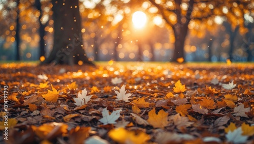 Paraphrased Title: "Orange fall leaves scattered in a park, sunny autumn natural scenery."
