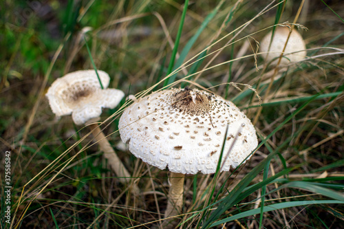 Parasol mushrooms in the forest in autumn. Macrolepiota procera