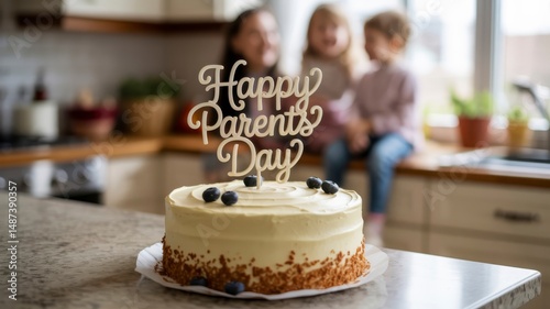 Parents' Day Celebration Festive cake with "Happy Parents Day" topper, set in a cozy kitchen with children in the background.