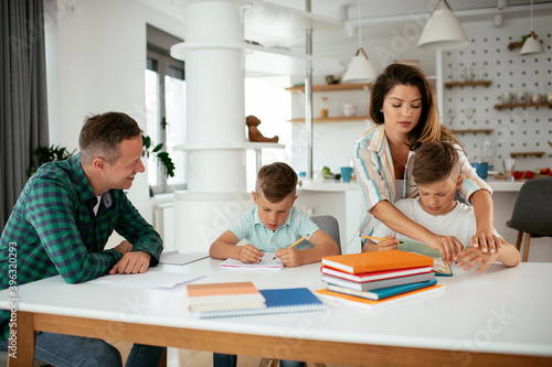 Parents helping the kids with their homework. Litlle boys learning at home..
