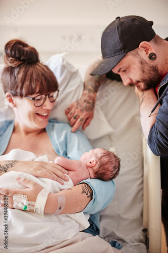 family, eltern, newborn, mother, father, children, people, hospital, baby, family life, woman, indoor, man, togetherness, sitting, standing, together, vertical, three people, day, beginning, optimism, positive, looking down, colours