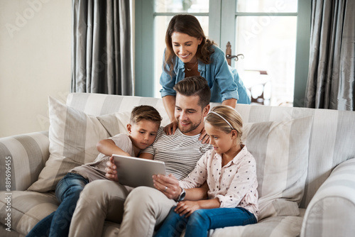 Parents, kids and happy with tablet in home on sofa for education games, cartoon and entertainment. People, family and smile on couch in living room with fun videos for child or brain development