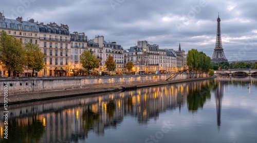 Paris Skyline Reflecting in the River Seine at Dusk with Classic Architecture and Eiffel Tower