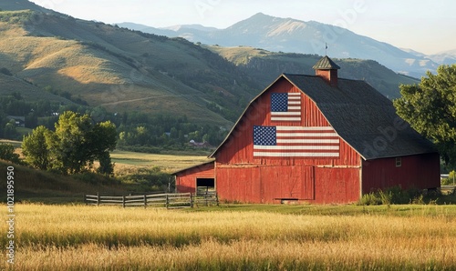 Park City Utah Barn farm summer landscape with American Flag