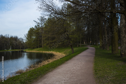 park in winter with forest and river.