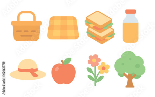 park, picnic, icon, flat, vector, mini, illustration, picnic, colours, children, basket, blanket, sandwich, juice, bottle, apple, sun, hat, flower, tree, design, designed, all