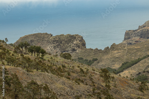 Parque Natural Majona. Northeastern part of La Gomera Island. Old volcanic mountains covered by green grass, thickets of relic laurels and heather on steep slopes. Canary Islands, Spain