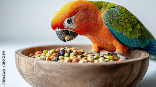 Parrot eating its special food from a plate, close-up, perspective from below, realistic details, bright colors, feeding exotic birds, healthy food for domestic birds