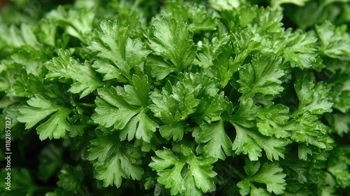 Parsley plants flourishing in a garden bed under soft sunlight, their vibrant green leaves in focus, with the background softly blurred.