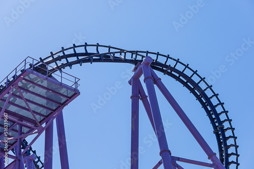 Part of a blue-purple rollercoaster against a cloudless blue sky. Extreme attraction. Metal construction.