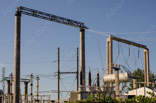 Part of high voltage electrical substation, blue sky background, Europe