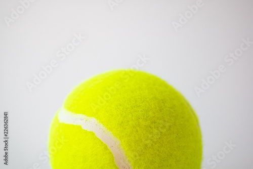part of new yellow tennis ball on white background, copy space on top