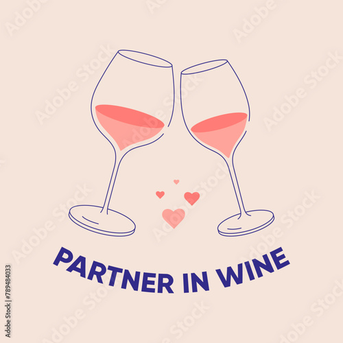 "Partner in Wine" line art drawing with text and hearts. Glasses of white and red wine, cheers. Flat illustration for greeting cards, postcards, invitations, menu design. Line art template.