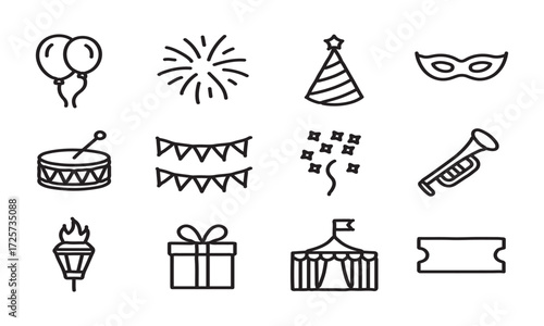 party, celebration, icon, set, vector, festival, illustration, design, clip art, balloon, confetti, gift, hat, mask, fireworks, drink, decor, holiday, festive, event, poster, graphic, collection, cartoon, stylish, creative, isolated, modern, template, fun, joy, ornament, art