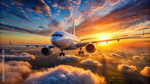 Passenger airplane is flying over dramatic clouds during a beautiful sunset