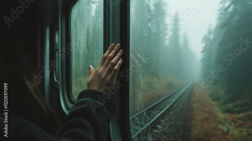 Passenger resting his hand against the window of a train, misty forest outside, generative ai