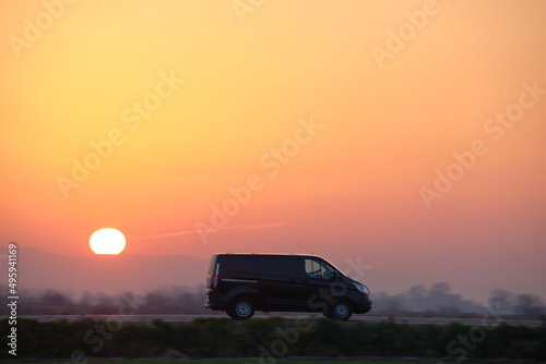 Passenger van driving fast on intercity road at sunset. Highway traffic in evening