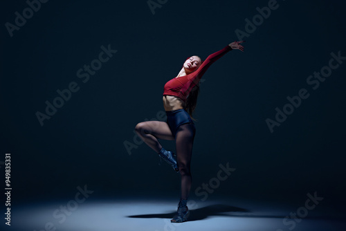 Passionate dance, elegant young woman dancing high heels dance, performing on stage against dark studio background. Concept of hobby, entertainment, performance, creativity, lifestyle