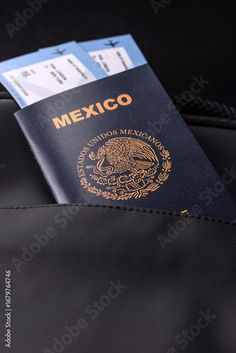 Passport Mexico, visa for travel, document with tickets in travel bag. Mexican passport