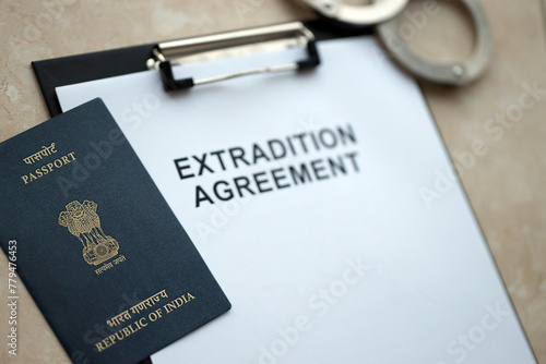 Passport of India and Extradition Agreement with handcuffs on table close up