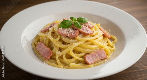 pasta, carbonara, bacon, basil, food, dish, meal, italian, cookery, spaghetti, white plate, lunch, dinner, creamy, delicious, parmesan, cheese, epicure, eatery, cooked, fresh, homemade, tasty, nourishment, eat, culinary, gastronomy, serving, prepared, plate, closeup, studio shot, indoor