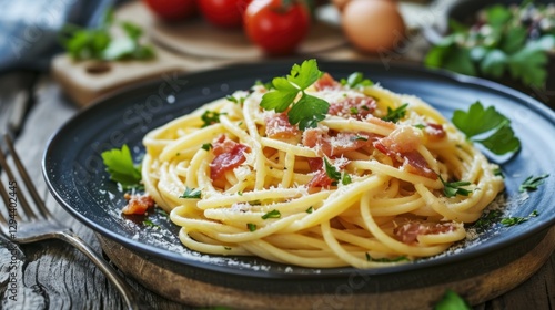 Pasta. Classic Carbonara Pasta, Traditional Italian Dish with Creamy Sauce, Crispy Pancetta, and Rich Cheese, Hearty Meal Isolated on Background with Copy Space. Italian Food Concept with Copy Space.