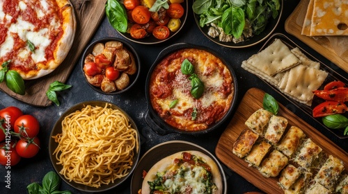 pasta, italian, dish, background, italy, epicure, sauce, fork, spoon, food, table, overhead, up high, view, mushroom, seafood, ravioli, cream, variety, wine, cheese, black, spaghetti, plate, tomatoes, basil, fettuccine, pappardelle, lunch, cookery, assortment, many, various, banner, menu, marinara, parmesan, eatery, drink, mediterranean, fine dining, dinner, meal