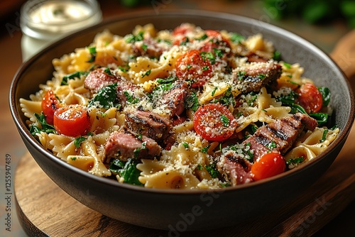 pasta, steak, tomatoes, bowl, herb, cheese, farfalle, dish, meal, grilled, spinach, food, cooking, dinner, lunch, cookery, italian, vegetable, healthy, nourishment, delicious, plate, eatery, epicure, fresh, ingredient, receipe, parmesan, cherry, greener, wood, table, closeup, presentation, culinary, rustic, simple, tasty, preparation, served, board, wooden, dining, studio, style, eat, artwork, ai, generated