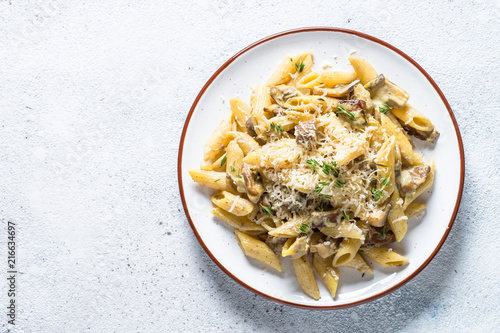 pasta, mushroom, vegan, vegetarian, cream, creamy, up high, aroma, basil, cheese, cooked, cookery, dinner, dish, eat, food, herb, italian, light, lunch, meal, mediterranean, oil, parmesan, penne, plate, receipe, eatery, rustic, sauce, spaghetti, stone, tagliatelle, thyme, top, traditional, vegetable, vegetarian, view, white, wood, wooden