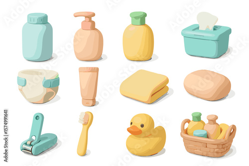 pastel, baby, bathe, duck, diaper, soap, hygiene, bottle, lotion, cream, towel, sponge, clipper, toothbrush, rubber, basket, care, infant, children, cute, soft, supply, health care, cleanliness, adorable, bath time, essential, grooming, item, clean, parenting, nourishment
