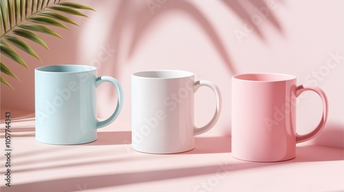Pastel background, coffee mug mockup with an angled view, soft shadow, and glossy finish, large area for custom design, and simple modern look.