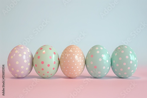 Pastel colored eggs with polka dots in a row on a two-toned pastel background