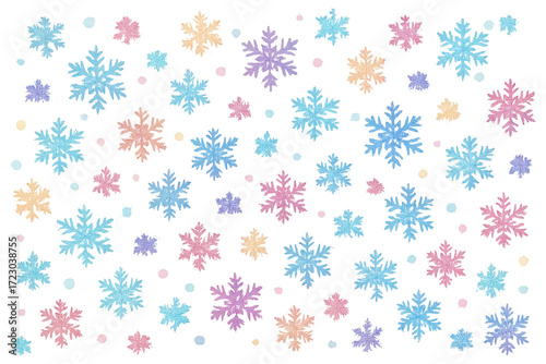 snowflake, winter, pattern, glistering, festive, snow, pastel, colourful, christmas, holiday, cold, season, frost, ice, abstract, ornament, decoration, new year, falling, design element, magic, sparkle, texture, celebration, happy, light, crystal, glacé, seasonal, graphic, illustration, iridescent, gentle, delicate, whimsical, vibrant, background, overlay, festive season, greeting card, invitation, banner, blue, pink, purple, yellow, orange